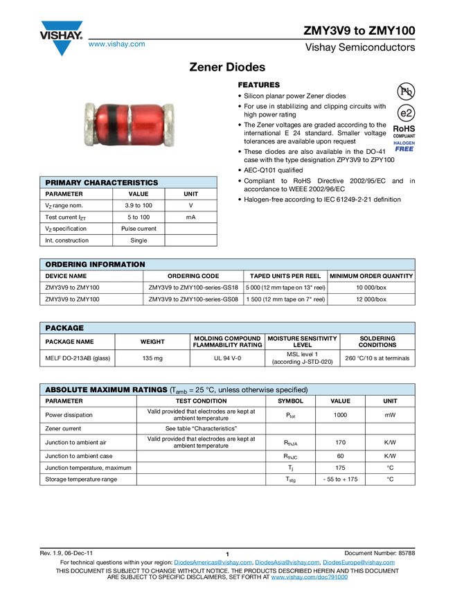 Vishay Dioda Zenera ZMY5V6-GS08 Typ obudowy półprzewodnika DO-213AB Napięcie Zenera 5.6 V Moc (maks) P(TOT) 1 W