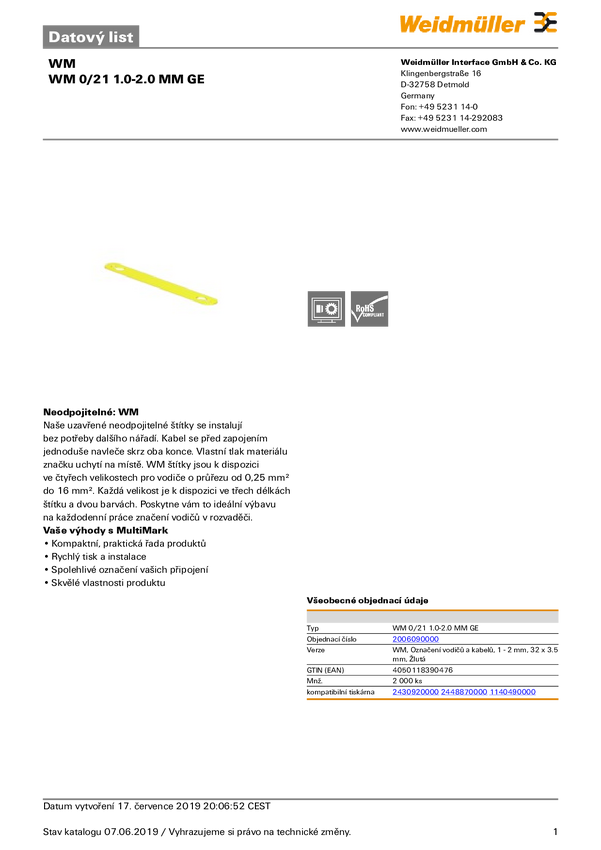 System znakowania kabli Weidmüller WM 0/21 1.0-2.0 MM GE 2006090000, 3.5 x 22 mm, 2000 szt.