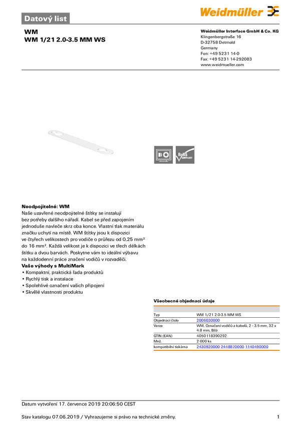 System znakowania kabli Weidmüller WM 1/21 2.0-3.5 MM WS 2006030000, 4.8 x 22 mm, 2000 szt.