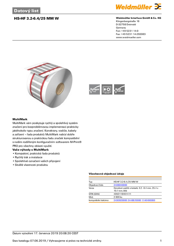 System znakowania kabli Weidmüller HS-HF 3.2-6.4/25 MM W 2438040000, 2000 szt.