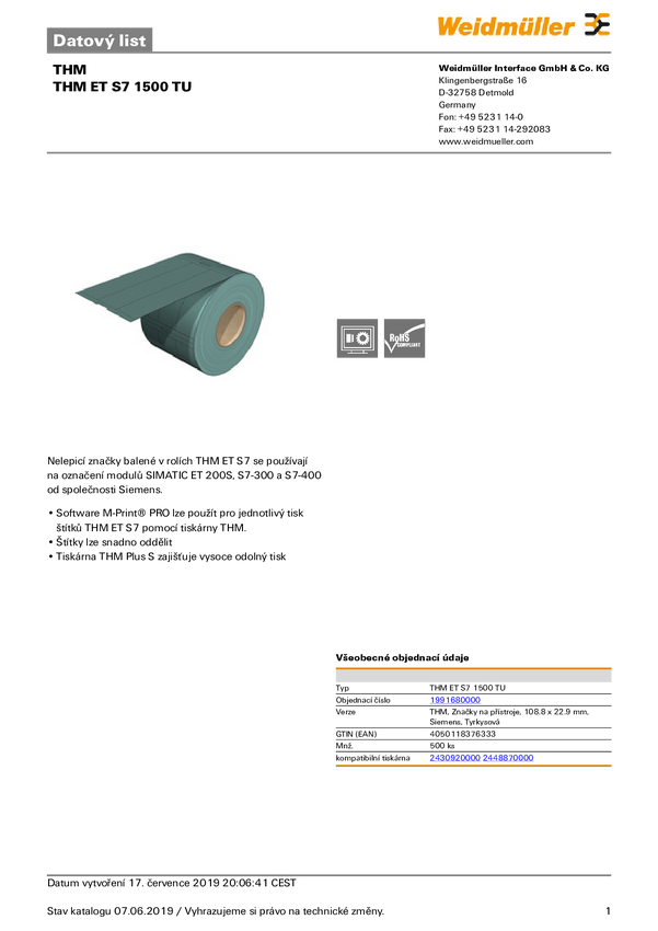 System znakowania kabli Weidmüller THM ET S7 1500 TU 1991680000, 500 szt.