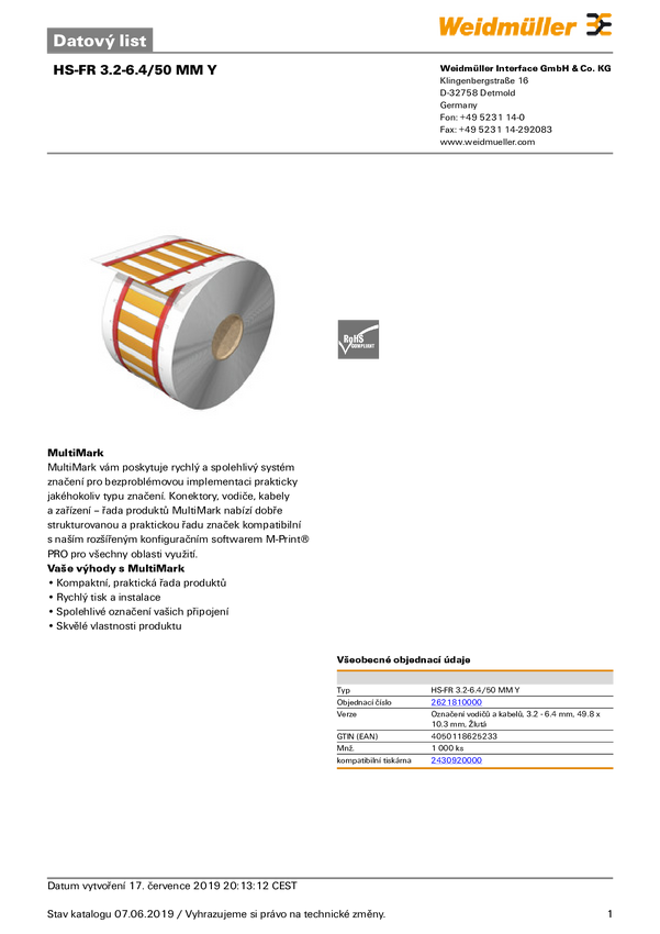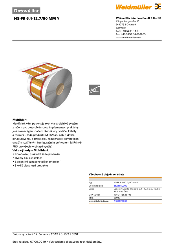 System znakowania kabli Weidmüller HS-FR 6.4-12.7/50 MM Y 2621850000, 49.8 x 19.9 mm, 500 szt.