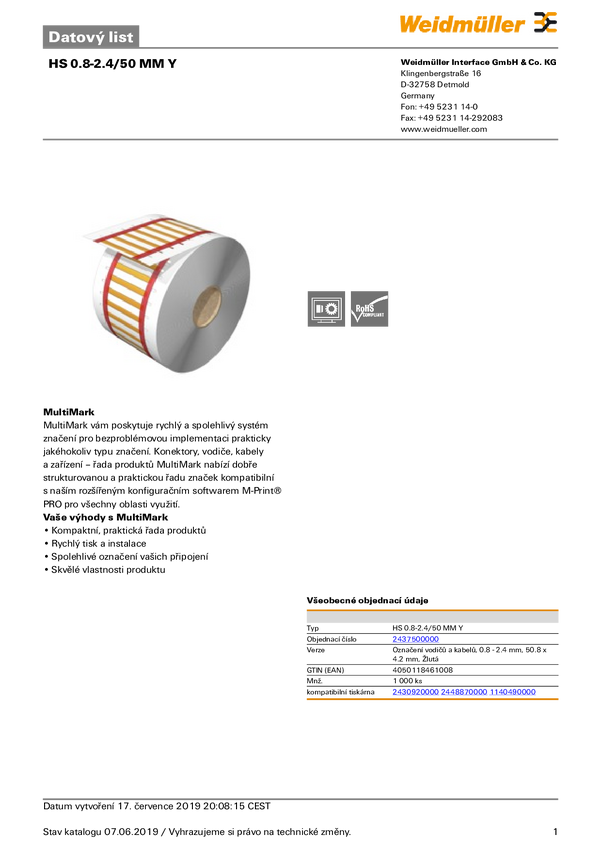 Weidmüller 2437500000 HS 0.8-2.4/50 MM Y System znakowania kabli żółty Ilość znaczników: 1000 1000 szt.