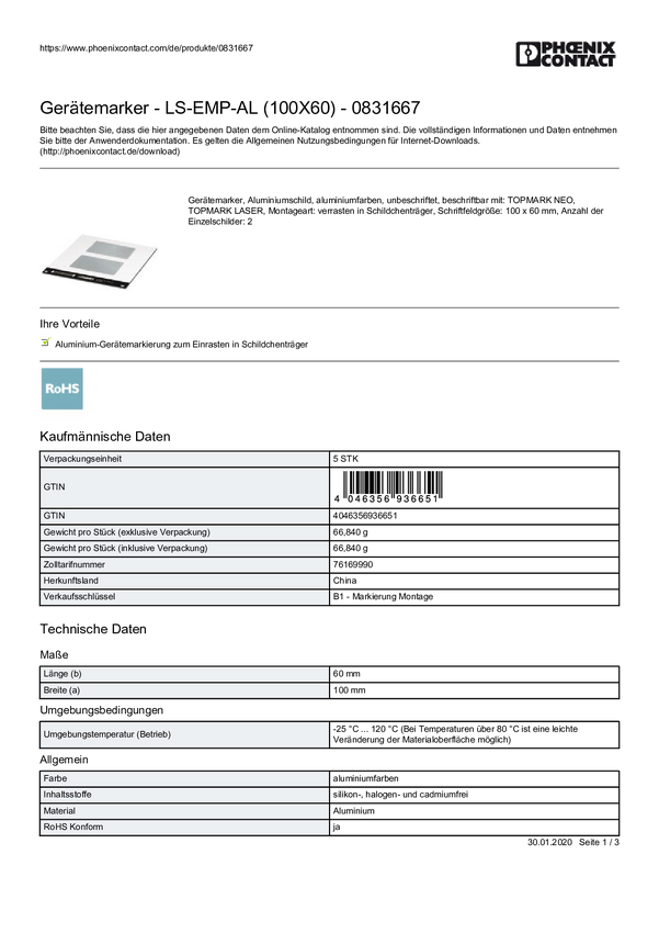 Tabliczka znamionowa Phoenix Contact LS-EMP-AL (100X60) 0831667, montaż: blokada, etykiety na arkuszu: 2, 5 szt.