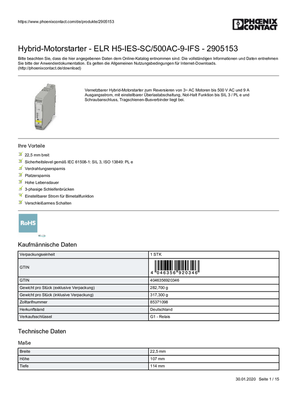 Phoenix Contact ELR H5-IES-SC/500AC-9-IFS 2905153 Rozrusznik silnika 24 V/DC Natężenie znamionowe 9 A