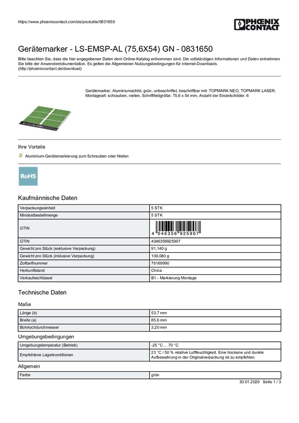Tabliczka znamionowa Phoenix Contact LS-EMSP-AL (75,6X54) GN 0831650, montaż: śruba, nit, etykiety na arkuszu: 6, 5 szt.