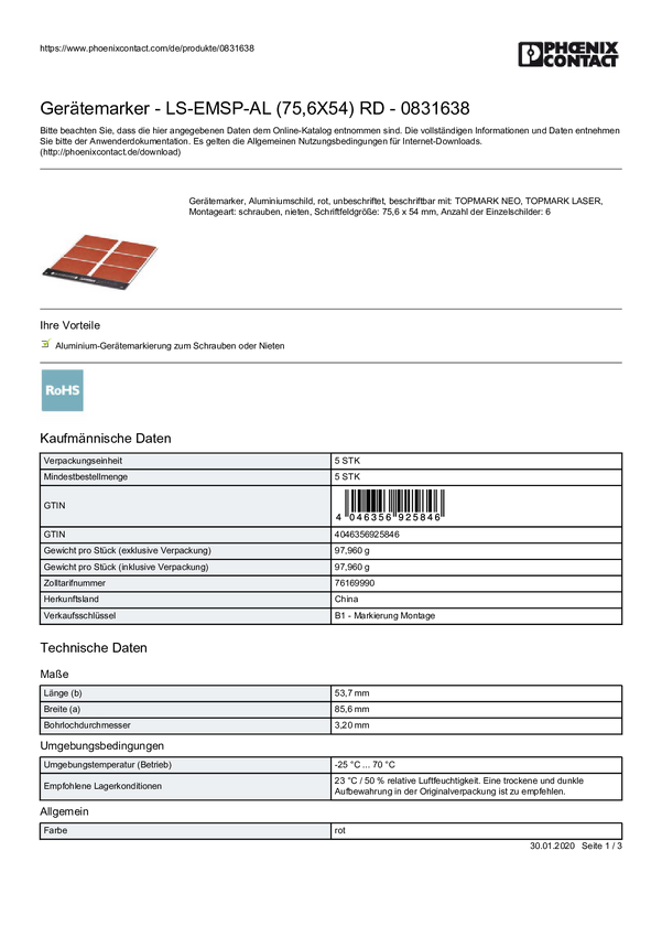 Phoenix Contact 0831638 LS-EMSP-AL (75,6X54) RD Tabliczka znamionowa Sposób montażu: śruba, nit czerwony Ilość znacznik