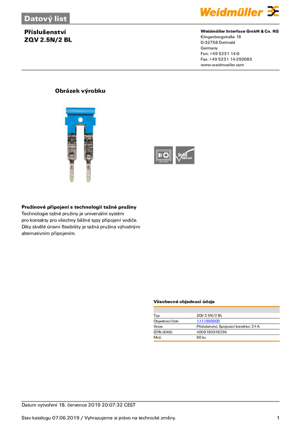 Łącznik krzyżowy Weidmüller ZQV 2.5N/2 BL 1527740000, 60 szt.
