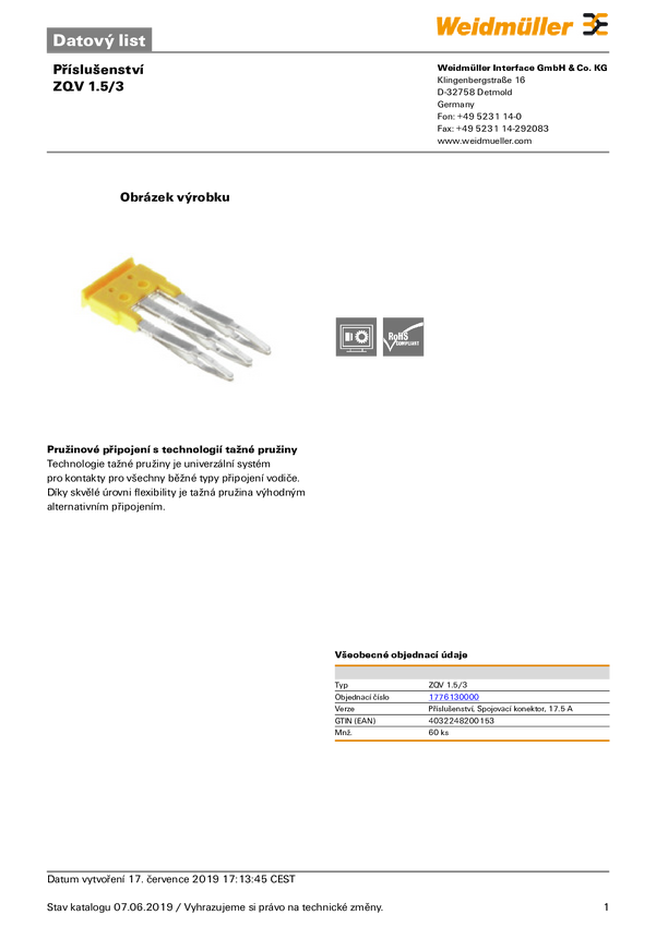 Łącznik krzyżowy Weidmüller ZQV 1.5/3 1776130000, 60 szt.
