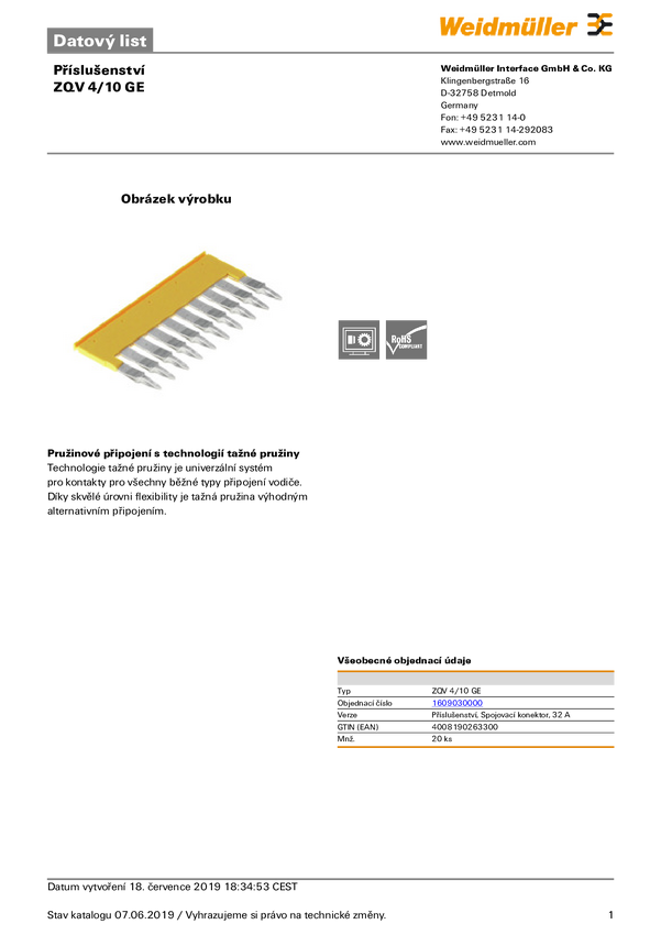 Łącznik krzyżowy Weidmüller ZQV 4/10 GE 1609030000-20, 20 szt.