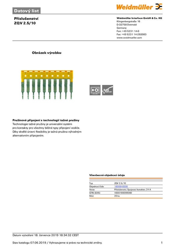 Łącznik krzyżowy Weidmüller ZQV 2.5/10 1608940000-20, 20 szt.