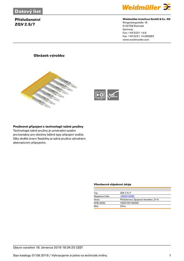 Łącznik krzyżowy Weidmüller ZQV 2.5/7 1608910000, 20 szt.