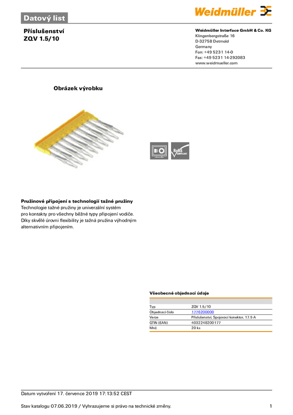 Łącznik krzyżowy Weidmüller ZQV 1.5/10 1776200000, 20 szt.
