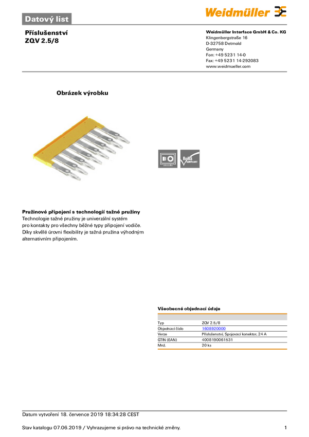 Łącznik krzyżowy Weidmüller ZQV 2.5/8 1608920000, 20 szt.