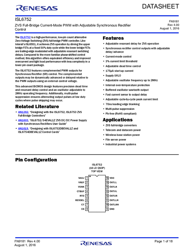 ZVS Full-Bridge PWM Controller with Adjustable Synchronous Rectifier Control