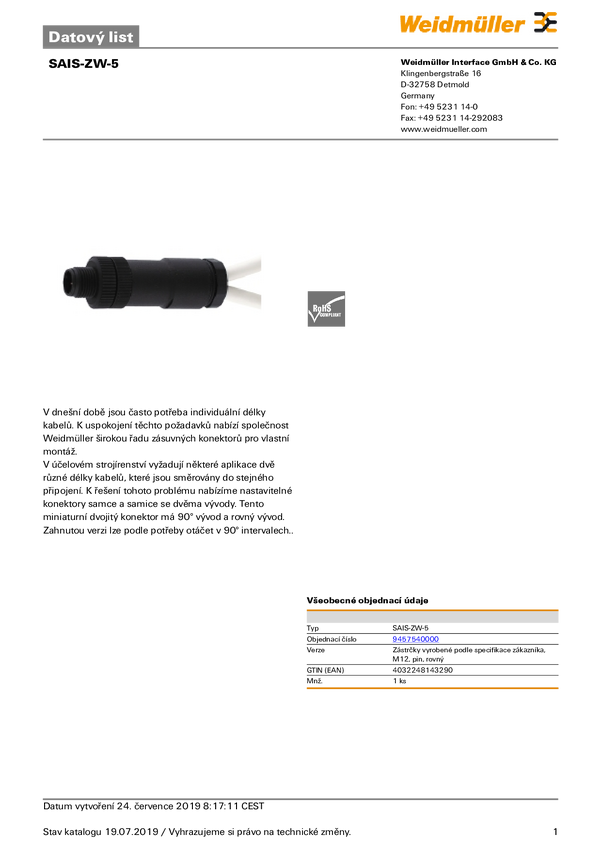 Złącze czujników/elementów wykonawcznych Weidmüller SAIS-ZW-5 9457540000 1 szt.