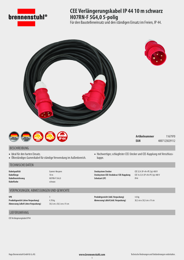 przedłużacz Brennenstuhl Brennenstuhl H07RN-F 5G4,0 Zwart 10 m 1167970, gniazdka: 1, H07RN-F 5G 4 mm², 400 V, 10.00 m