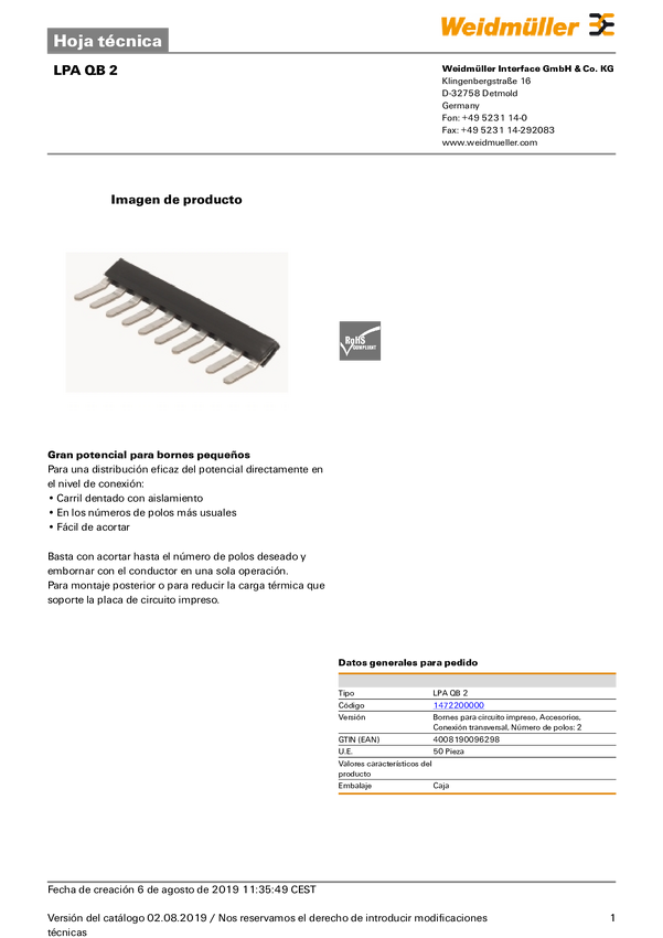 Weidmüller 1472200000 Zworka grzebieniowa Ilość styków 2 50 szt.