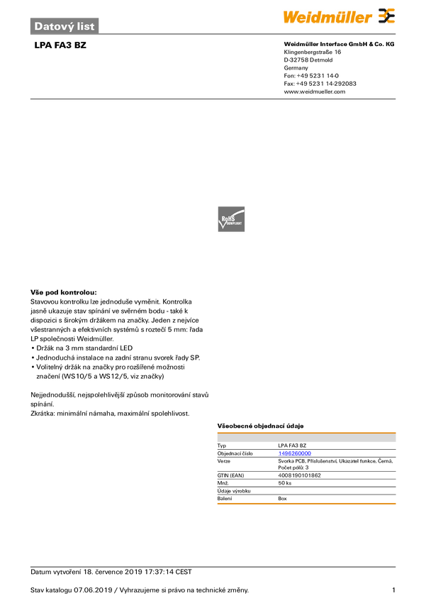 Weidmüller 1496060000 Zworka grzebieniowa Ilość styków 3 czarny 50 szt.