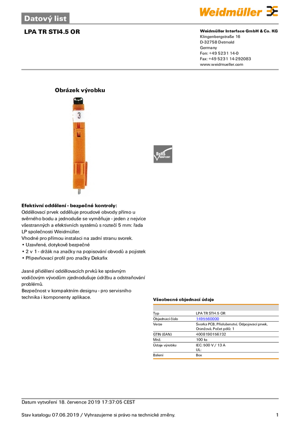 Weidmüller 1495160000 Zworka grzebieniowa Ilość styków 1 pomarańczowy 50 szt.
