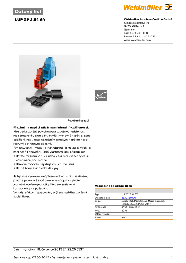 Weidmüller 1837580000 Zworka grzebieniowa Ilość styków 1 szary krzem 50 szt.
