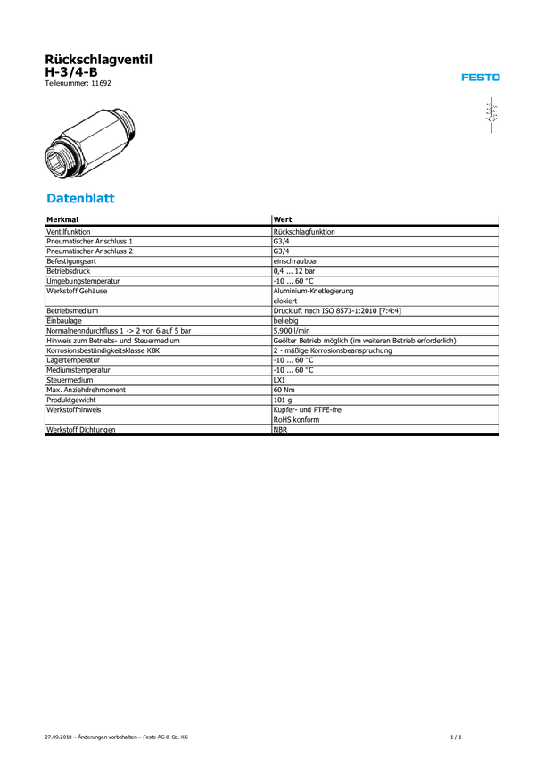 Zawór zwrotny FESTO H-3/4-B 11692, 0.4 do 12 bar