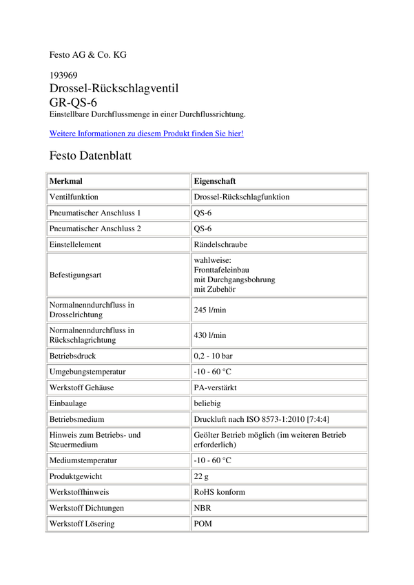 Zawór zwrotny FESTO GR-QS-6 193969, 0.2 do 10 bar