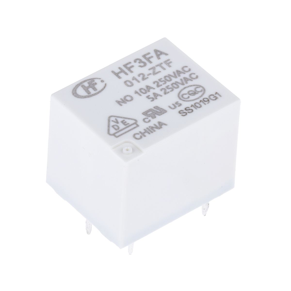 Na Hongfa SPDT, 1-biegunowe bez podtrzymania montaż PCB jest sterowany przy pomocy 12VDC Coil i do10A DC/AC lub 5A DC/AC prąd płynący przez Coil w obu konfiguracjach, NC i NO do położeń przełącznika.