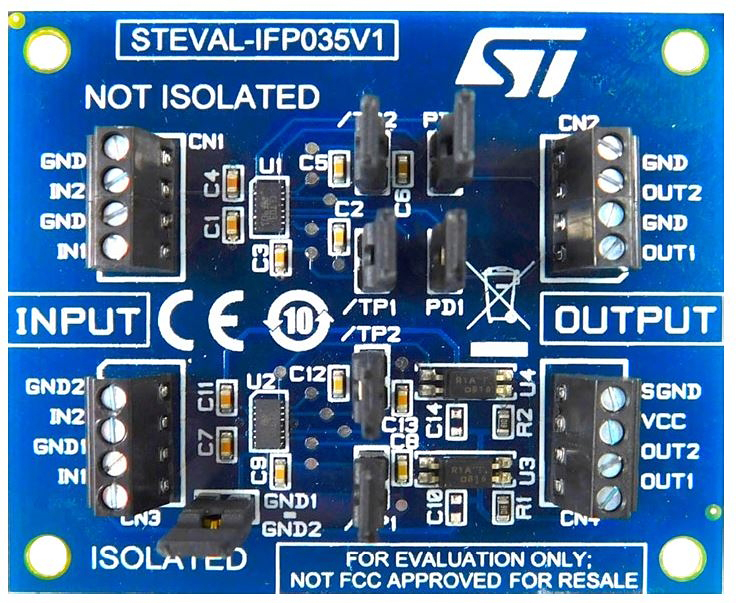 Płytka ewaluacyjna STEVAL-IFP035V1 została zaprojektowana w celu ułatwienia oceny strategii zabezpieczeń obwodów dla automatyzacji fabrycznej przy użyciu cyfrowych ograniczników prądu pomiędzy przemysłowymi czujnikami a jednostkami przetwarzającymi, takimi jak programowalne sterowniki logiczne (PLC).