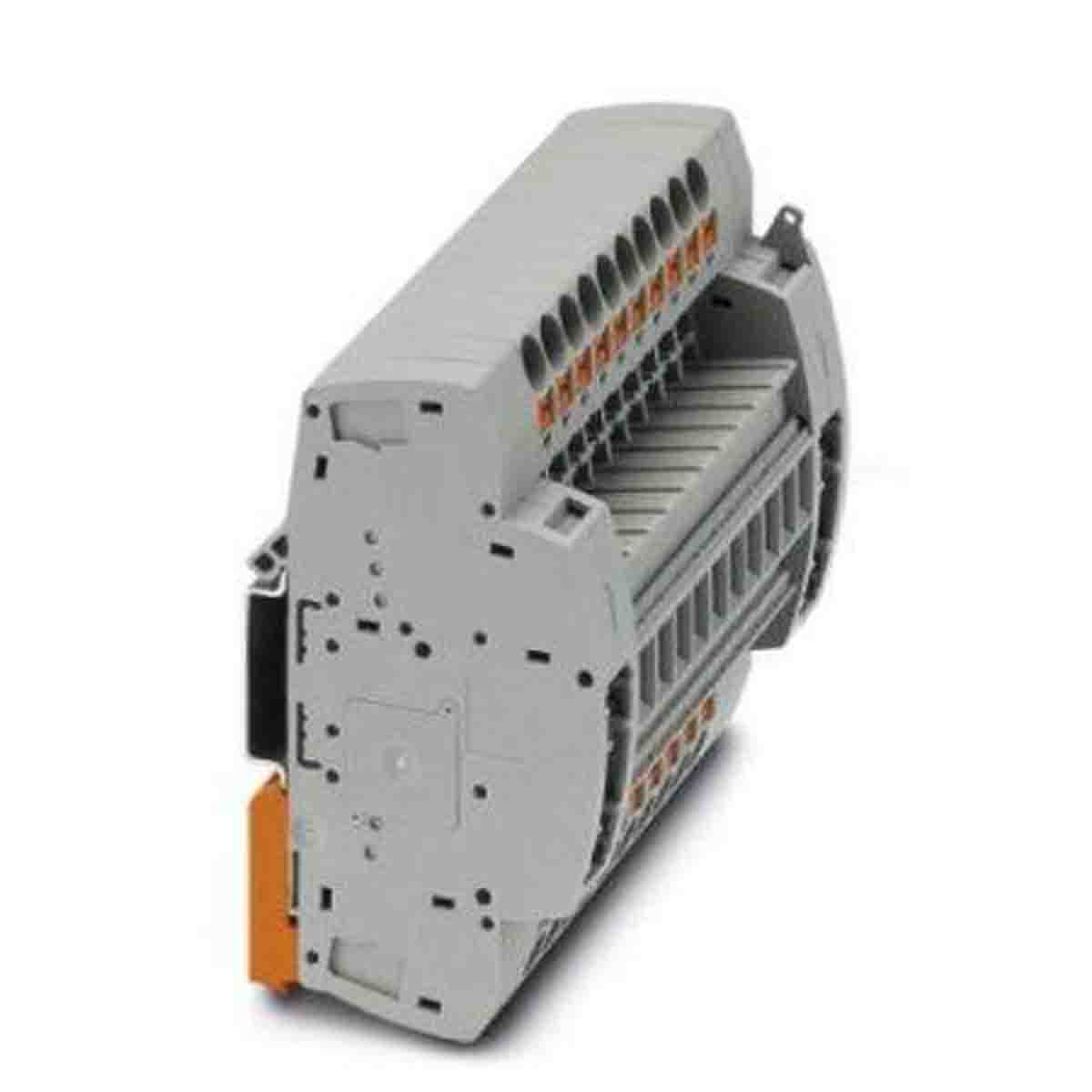 Szara listwa terminal testowy Phoenix Contact PTRE do montażu na szynie DIN z 22 złączami, o szerokości 122,3 mm, spełnia najbardziej rygorystyczne wymagania, a zastosowanie materiałów wysokiej jakości zapewnia przesyłanie prądów sygnałowych, nawet po wielu uruchomieniach.
