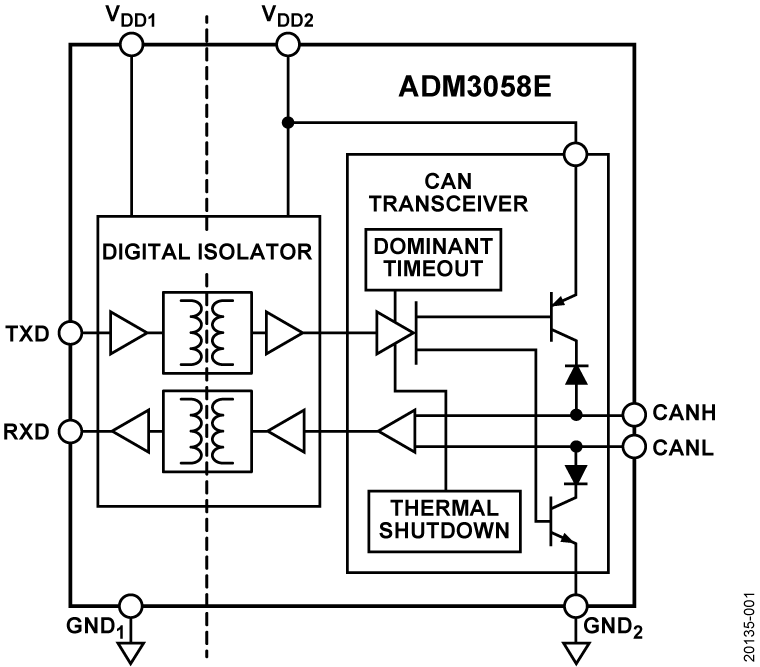 The device employs Analog Devices, Inc., iCoupler® technology to combine a 2-channel isolator and a CAN transceiver into a single small outline integrated circuit (SOIC) surface-mount package. The ADM3058E is a fully isolated solution for CAN and CAN FD applications. The ADM3058E provides isolation between the CAN controller and physical layer bus. Safety and regulatory approvals (pending) for a 5.7 kV rms withstand voltage and a 1500 V peak working voltage ensure that the ADM3058E meets application isolation requirements.