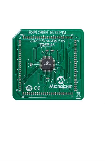 Moduł Microchip Plug-in module (PIM) jest wyposażony w 48-stykowy cyfrowy kontroler sygnału dsPIC33CK64MP105 (DSC) i może być używany do oceny urządzeń dsPIC33CK64MC10x i dsPIC33CK32MC10x z płytą rozwojową Explorer 16/32.