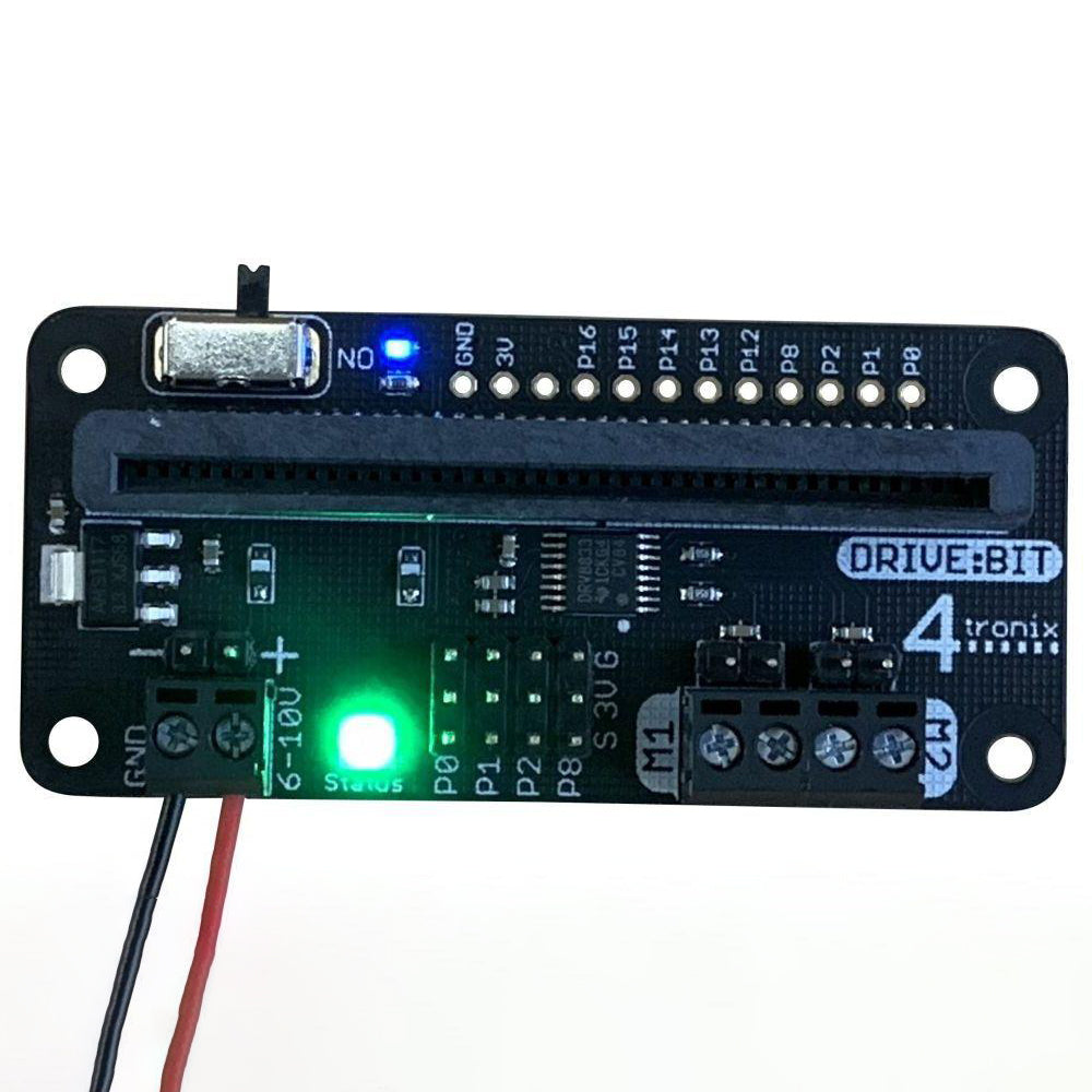 This affordable, ready-assembled robotics controller board is ready to accept your micro:bit, battery power (6 to 10V) and motors of your choice to make your own DIY robot.