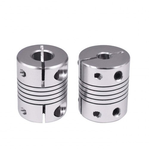 Different clamping construction allows more contact area between coupler and shaft, allowing better grip and more torqueThose are used to connect shaft or lead screw to stepper motor. Mostly used in 3dprinters and CNC. Helical (spiral) compliant construction of this coupler allows absorption of parallel or angular misalignment and shaft end-play by spring action.Please remember, when used in vertical arrangement (Z axis) helix will sag due to gravity and rest on parallel surfaces of end of shafts and lead screw or helix itself cancelling capacity to compensate angular misalignment.We recommend putting small bearing ball between shaftsColor: SilverType: Flexible Shaft CouplingMaterial: Aluminium AlloyClamps around shaft allowing better centering and more grip, extra set screw allows to press against Dgrove on shaftInner Diameter: 5mm x 8mmOutside Diameter: 19mmLength: 25mm