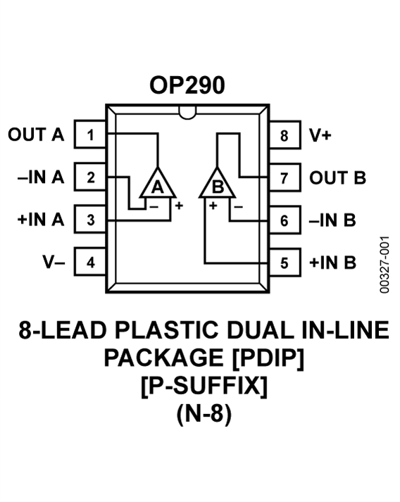 The OP290 is a high performance micropower dual op amp that operates from a single supply of +1.6V to +36V or from dual supplies of ±0.8V to ±18V. Input voltage range includes the negative rail allowing the OP290 to accomodate input signals down to ground in single supply operation. The OP290s output swing also includes ground when operating from a single supply, enabling zero-in, zero-out operation.