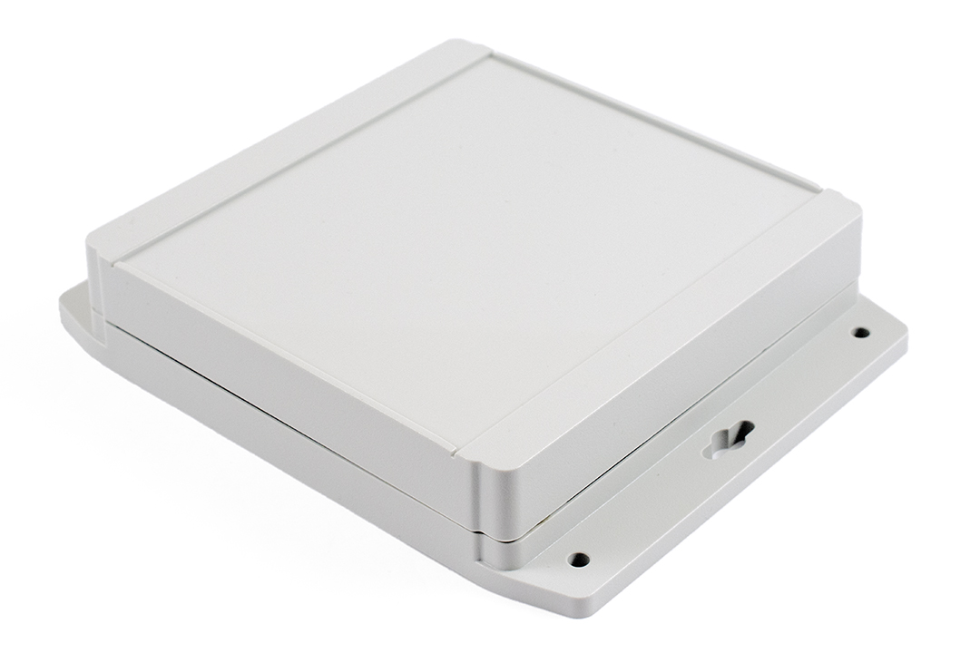 Wodoodporna obudowa ABS z kołnierzową obudową LID Hammond 1555F. Ma wymiary 6.3 x 6.3 x 1.48 cali. Tworzywo sztuczne ABS ogólnego przeznaczenia (materiał posiada klasę łatwopności UL UL94 HB).