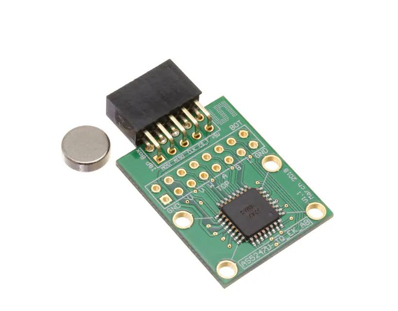 Płytka adaptera ams AS5247U to mała płytka drukowana do szybkiego testowania lub oceny czujnika położenia magnetycznego AS5247U.