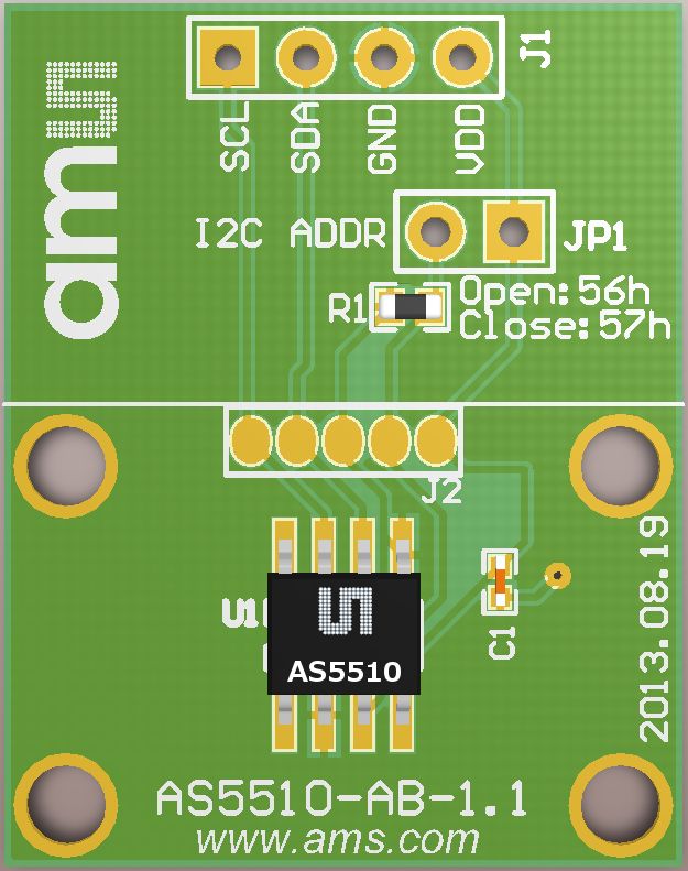 Płytka adaptera ams AS5510 to prosty obwód umożliwiający szybkie testowanie i ocenę enkodera liniowego AS5510 bez konieczności budowania urządzenia testowego lub płytki drukowanej.