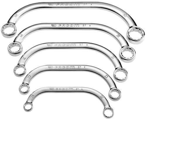 Zestaw 5 metrycznych kluczy oczkowych z przesunięciem półksiężyca Facom. Półksiężycowe klucze oczkowe z przesunięciem pozwalają na manewrowanie nakrętkami niedostępnymi za pomocą klasycznego narzędzia.