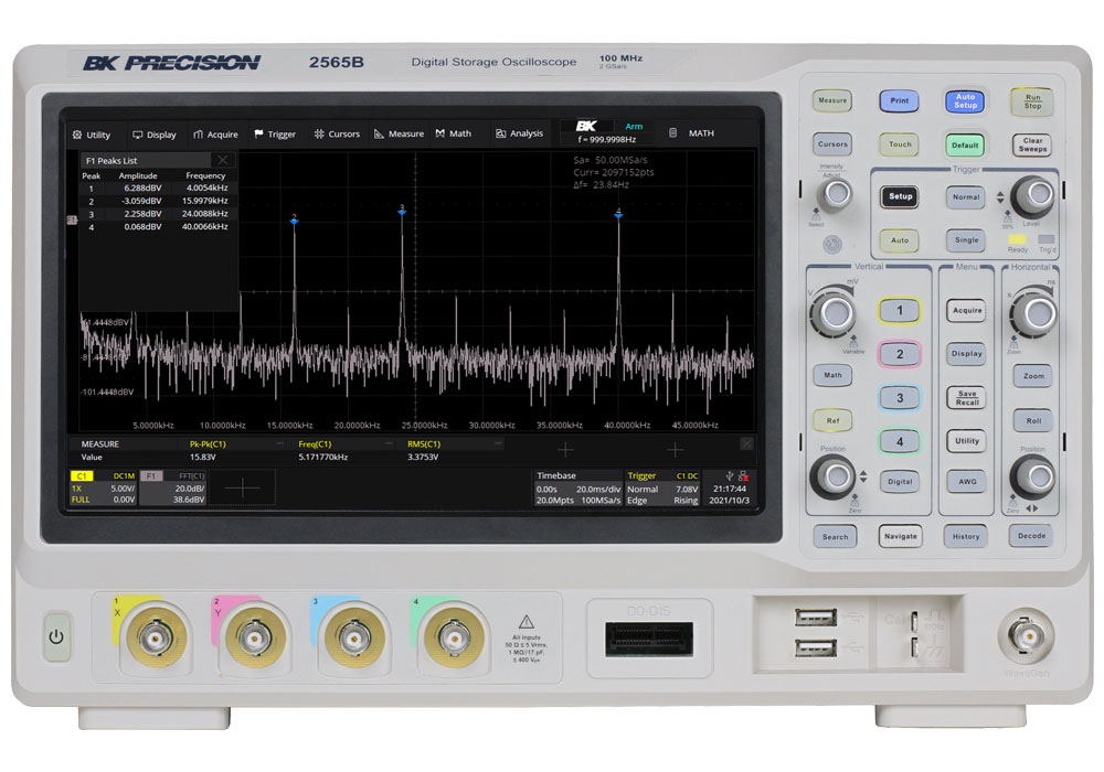 Seria oscyloskopów cyfrowych (DSO) i oscyloskopów sygnałów mieszanych (MSO) BK2560B oferuje modele o szerokości pasma 100 MHz, 200 MHz i 350 MHz w konfiguracji 4-kanałowej, z częstotliwością próbkowania 2 GSa/s i maksymalną głębokością pamięci 200 Mpts.