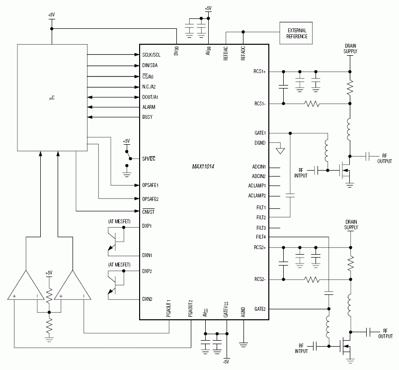 Each device includes dual high-side current-sense amplifiers to monitor the MESFET drain currents through the voltage drop across the sense resistors in the 0 to 625mV range. External diode-connected transistors monitor the MESFET temperatures while an internal temperature sensor measures the local die temperature of the MAX11014/MAX11015. The internal DAC sets the voltages across the current-sense resistors by controlling the GATE voltages. The internal 12-bit SAR ADC digitizes internal and external temperature, internal DAC voltages, current-sense amplifier voltages, and external GATE voltages. Two of the 11 ADC channels are available as general-purpose analog inputs for analog system monitoring.