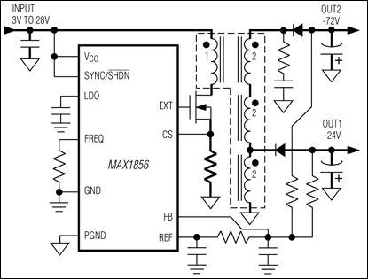 The MAX1856 offers a low-cost solution for generating a SLIC (ringer and off-hook) power supply. Using standard off-the-shelf transformers from multiple vendors, the MAX1856 generates various output voltages: -24V and -72V (dual output) for both ringer and off-hook supplies for voice-enabled broadband consumer premises equipment (CPE), -48V for IP phones and routers, -5V and -15V (single or dual output) for DSL CO line drivers, or negative voltages as high as -185V for MEMS bias supplies. The output voltages are adjusted with an external voltage divider.