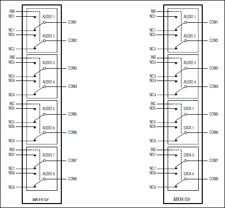 The MAX4758 has eight 0.5Ω on-resistance switches to switch audio signals. The MAX4759 has four 0.5Ω on-resistance switches to route audio signals and four 25pF capacitance switches to route data signals. The MAX4758/MAX4759 have four logic inputs to control the switches in pairs.