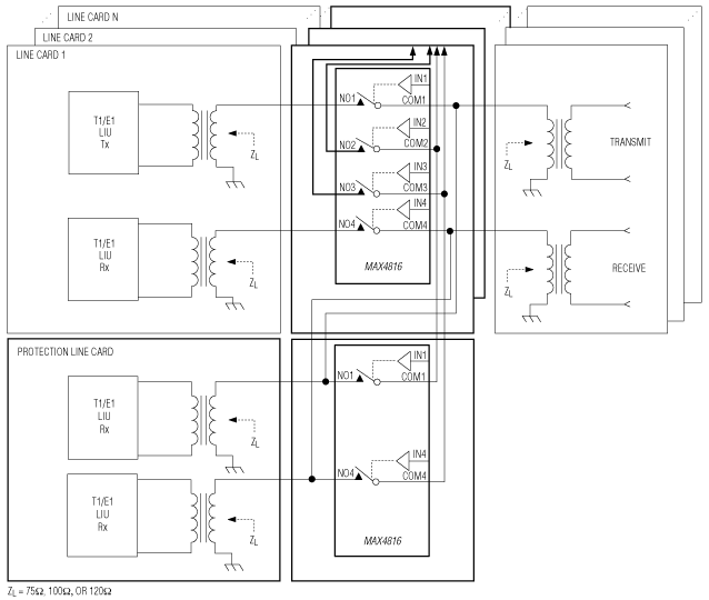 The MAX4815/MAX4816/MAX4817 high-bandwidth, low-on-resistance, quad-SPST analog switches are designed to serve as integrated T1/E1 protection switches for 1+1 and N+1 line-card redundancy applications. Each MAX4815/MAX4816/MAX4817 replaces four electromechanical relays, significantly reducing board space, simplifying PC board routing, and reducing power consumption. These devices operate with ±3.3V or ±5V dual supplies for applications requiring T1/E1 signal switching in the line side of the interface transformer. Internal voltage multipliers drive the analog switches, yielding excellent linearity and low 3.7Ω typical on-resistance within the T1/E1 analog signal range. This high-bandwidth (550MHz typical) family of products is optimized for low return loss and matched pulse template performance in T1/E1 long-haul and short-haul applications.