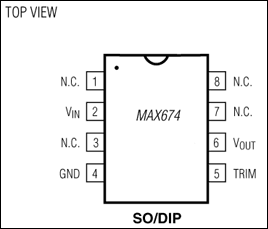 The MAX674 is a precision voltage reference that is pretrimmed to within ±0.15% of 10V. The reference features excellent temperature stability (as low as 12.0ppm/°C guaranteed), low current drain, and low noise. It is supplied in the space-saving narrow SO package, as well as, the standard 8-pin plastic DIP package.