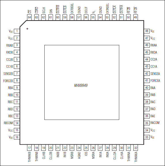 The MAX9949D/MAX9950D feature an integrated 10kΩ force-sense resistor between FORCE and SENSE. The MAX9949F/MAX9950F have no internal force-sense resistor. These devices are available in a 64-pin 10mm x 10mm, 0.5mm pitch TQFP package with an exposed 8mm x 8mm die pad on the top (MAX9949) or the bottom (MAX9950) of the package for efficient heat removal. The exposed paddle is internally connected to VEE. The MAX9949/MAX9950 are specified over the commercial (0°C to +70°C) temperature range.