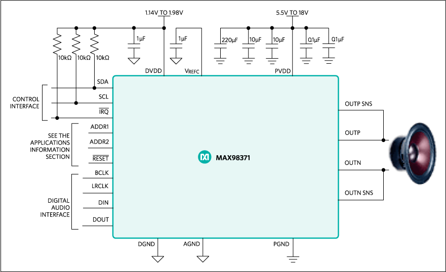 The MAX98371 is a high-efficiency, mono Class D audio amplifier featuring dynamic headroom tracking (DHT). DHT automatically optimizes the headroom available to the Class D amplifier as the power supply voltage varies, due to sudden transients and declining battery life to maintain a consistent listening experience. A wide 5.5V to 18V supply range allows the device to reach 19W into an 8Ω load.