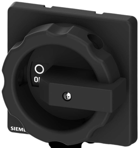 Obrotowy mechanizm sterujący serii Siemens SENTRON 3LD z czarną dźwignią uruchamiającą. It to akcesoria używane do wyłącznika głównego i wyłącznika awaryjnego 3LD2 o natężeniu od 16 A do 32 A.