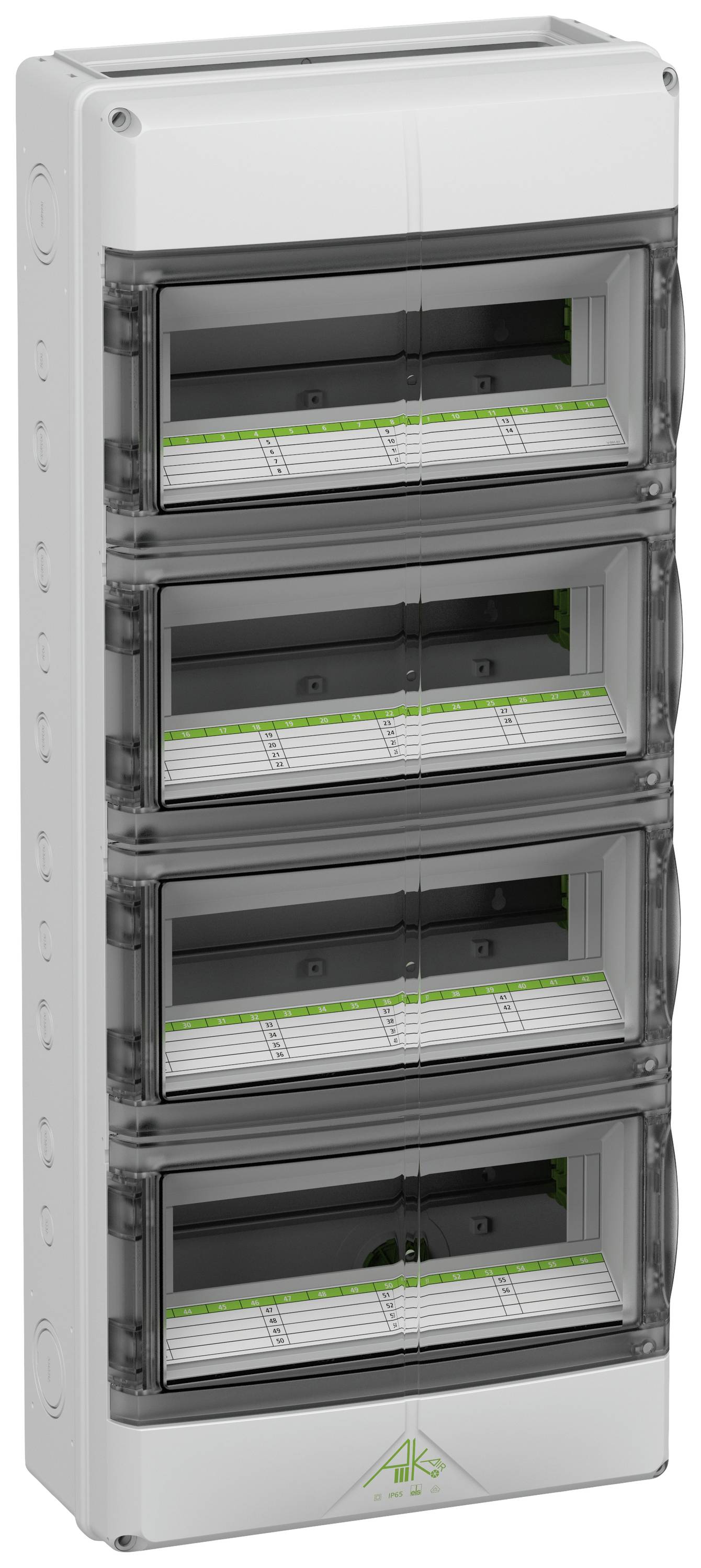 Mały rozdzielacz, jakość przemysłowa, typ kołnierzowy, z otwartymi powierzchniami czołowymi, do stosowania z różnymi kołnierzami, do łączenia kilku rozdzielaczy AK-F za pomocą kołnierza kombinowanego, 4 rzędy, 56 modułów, rozstaw szyn 150 mm, zintegrowane elementy wentylacyjne w celu zmniejszenia powstawania Taśmy kondensacyjne, zakrywające i etykietujące z dodatkowymi podwójnymi uszczelkami membranowymi i innymi akcesoriami, kołnierze i zestawy kołnierzy należy zakupić osobno, bezśrubowe szyny zaciskowe PE / N każda z 6 przykręcanymi punktami zaciskowymi 2,5-16 mm2, 21/2 x 14 bezśrubowych punktów zaciskowych 1,5 mm-4 qmm