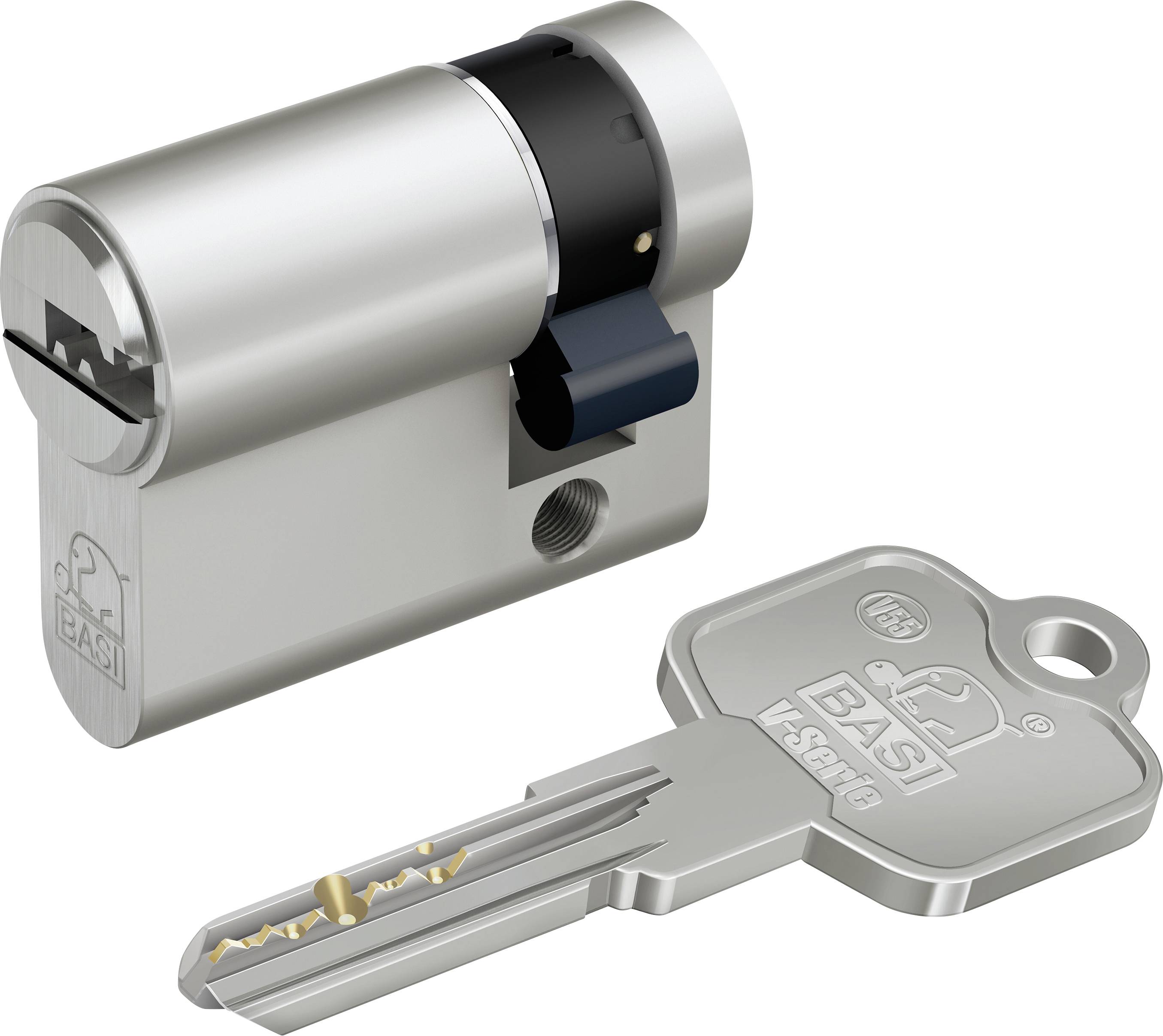 Półcylindry mają mechanizm blokujący klucz tylko z jednej strony. Nowy, wysokiej jakości półwkładka bębenkowa o profilu V55 z dwustronnym kluczem jest zatem idealnym zamkiem do drzwi garażowych lub przełączników na klucz. Cylinder profilowy ma długość 10/30 mm - co odpowiada zwykłemu standardowemu rozmiarowi. V55 jest wykonany z wysokiej jakości materiałów, które obiecują długą żywotność i wysoką odporność na zużycie. Półcylindra jest wykonany z litego mosiądzu i jest wyposażony w 5 kluczy z wgłębieniami. Ponadto zastosowanie zamka z wgłębieniami zapewnia ochronę przed kradzieżą i wierceniem, co zapewnia dodatkowe zabezpieczenie drzwi. Zabezpieczenie przed kradzieżą to urządzenie zabezpieczające, które uniemożliwia odblokowanie wkładki bębenkowej za pomocą narzędzi. W tak zwanym lockpickingu narzędzia, takie jak wytrychy, są wkładane do rowka wpustowego w celu wybicia poszczególnych kołków, aby móc obrócić wirnik cylindra. Zabezpieczenie przed przewierceniem to zabezpieczenie zapobiegające przewierceniu rdzenia cylindra. Kołki w rdzeniu cylindra wykonane są z hartowanej stali, aby ograniczyć możliwość wiercenia.